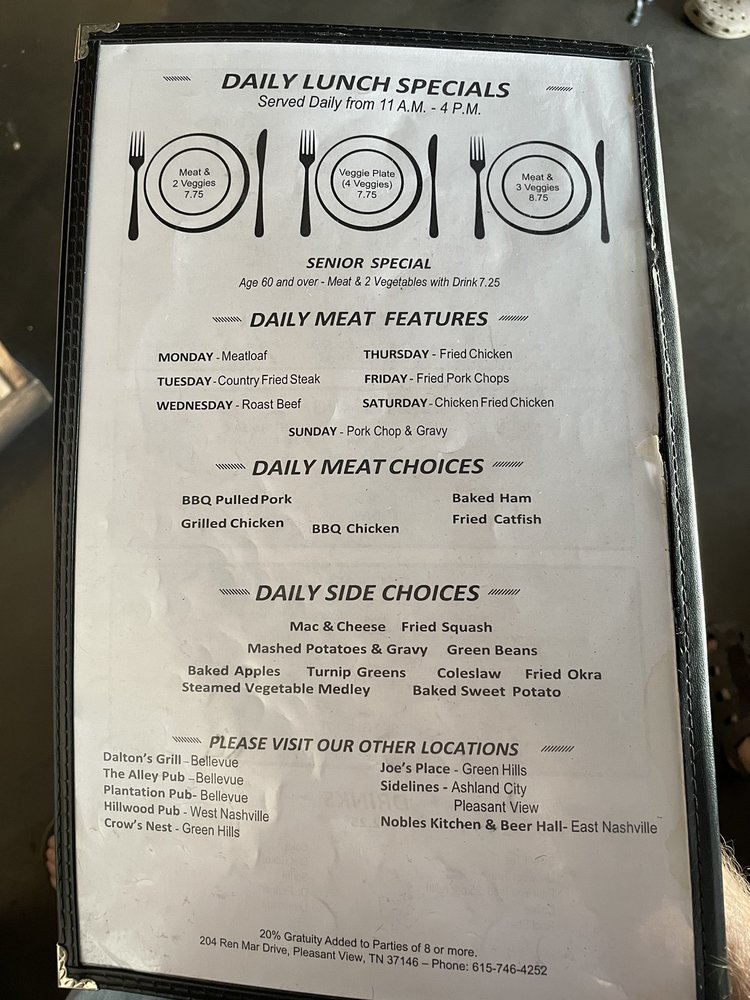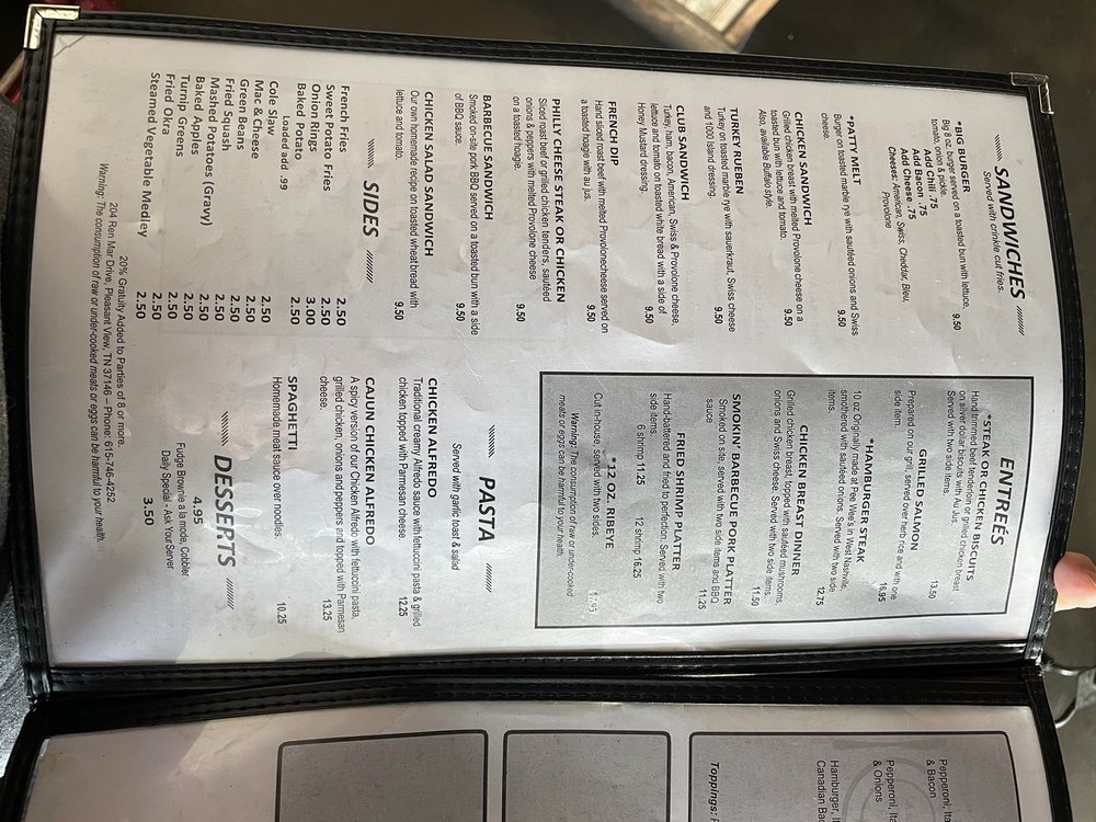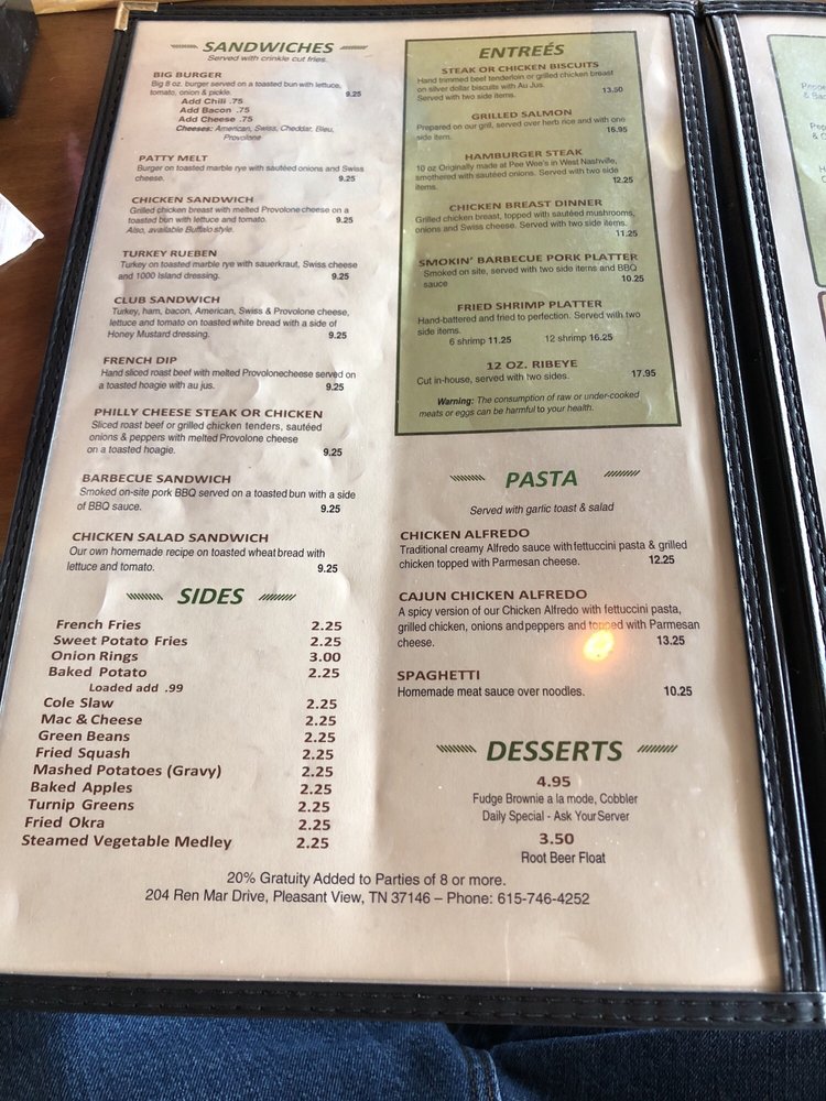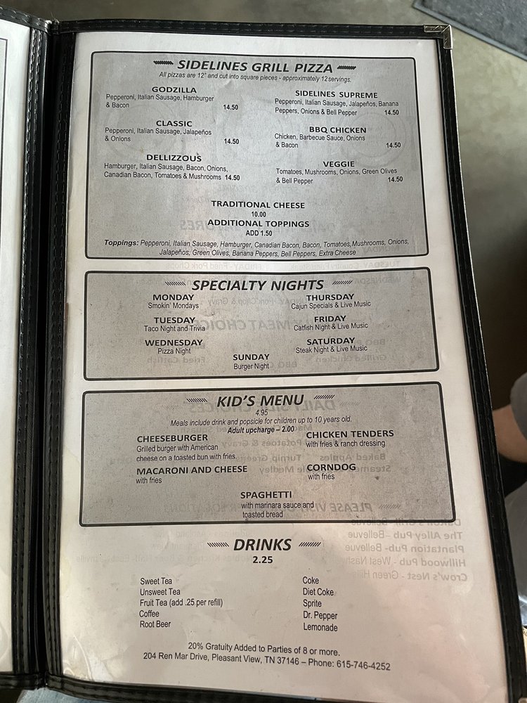"sidelines grill" is a neighborhood gem offering an array of New American, Cajun/Creole, and burger options. Located at 204 Ren Mar Dr Pleasant View, TN, this spot provides a comfortable and inviting atmosphere with outdoor seating, free Wi-Fi, a full bar, and even drive-thru service. The menu boasts many vegetarian options, and customers praise the friendly and efficient service.