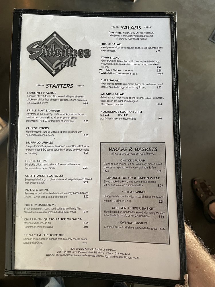 Highlighted dishes include the chicken sandwich, steak biscuits, and the surprisingly satisfying side salad. While some customers have experienced inconsistency with takeout orders, dining in seems to guarantee a more enjoyable experience. With a variety of food options, attentive staff, and a pleasant ambiance, "sidelines grill" is a local favorite worth visiting for a casual meal or a gathering with friends and family.